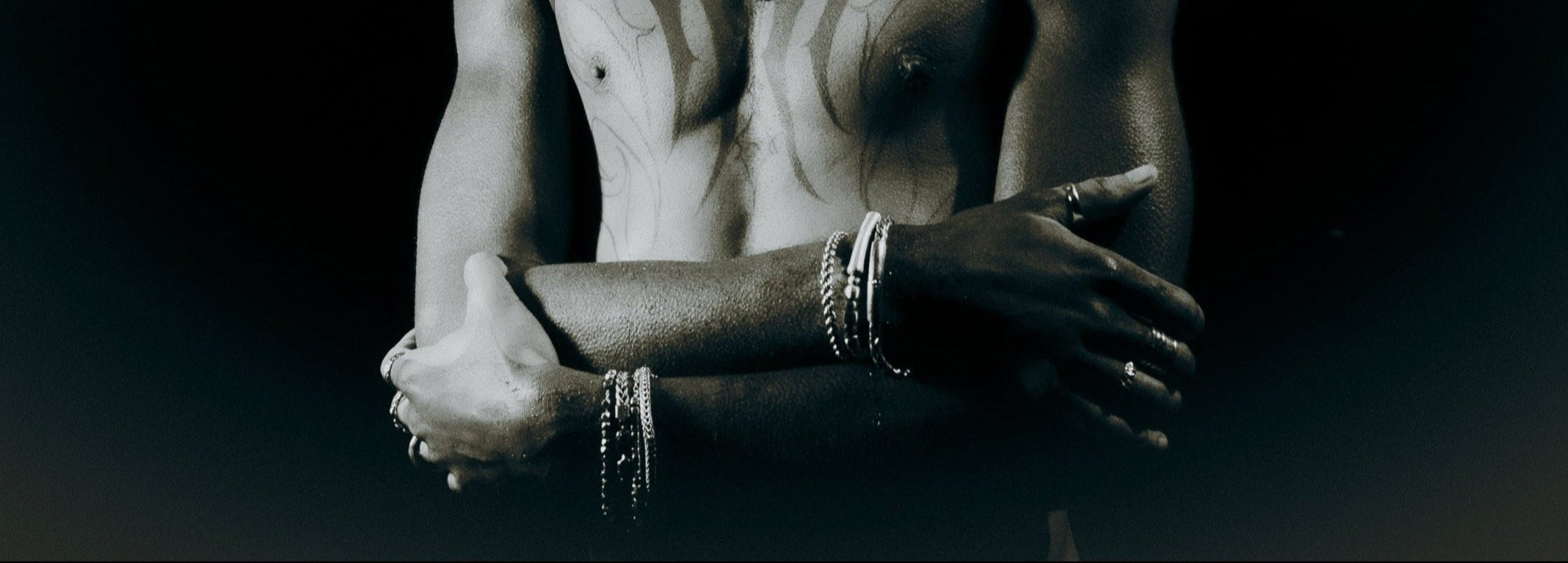 [full] Person with tattoos on arm and hand wearing a pure 999 fine silver bracelet, and a black outfit with white designs.