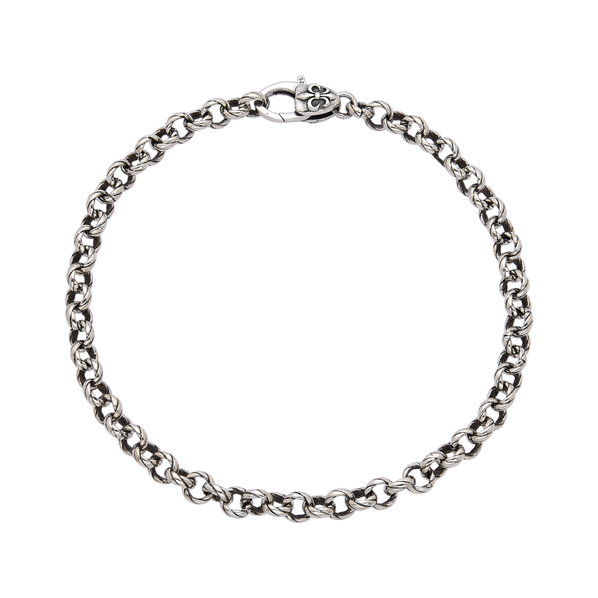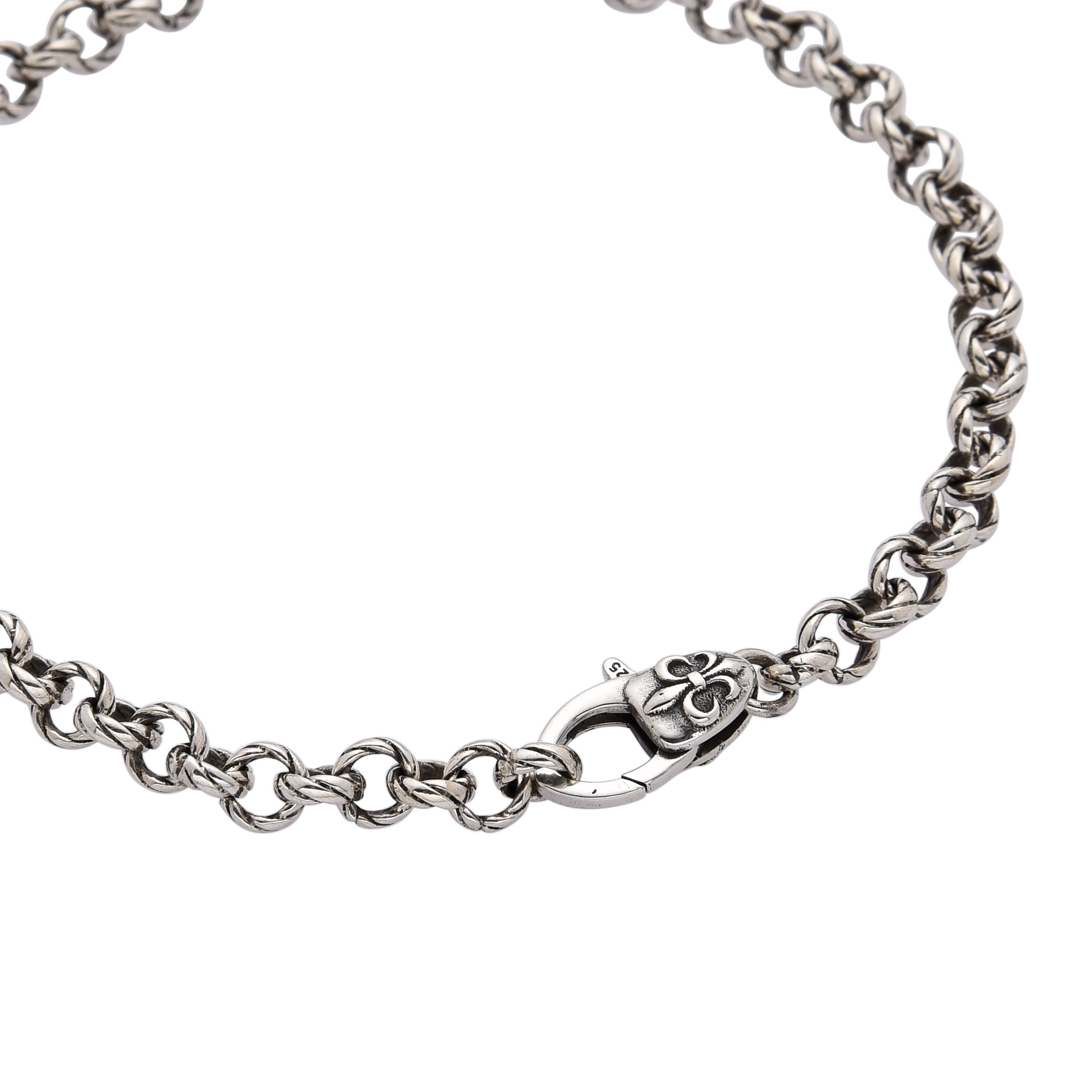 Sterling silver links with a layered rope-like structure. Finished with a detailed clasp for a tactile, dimensional look.