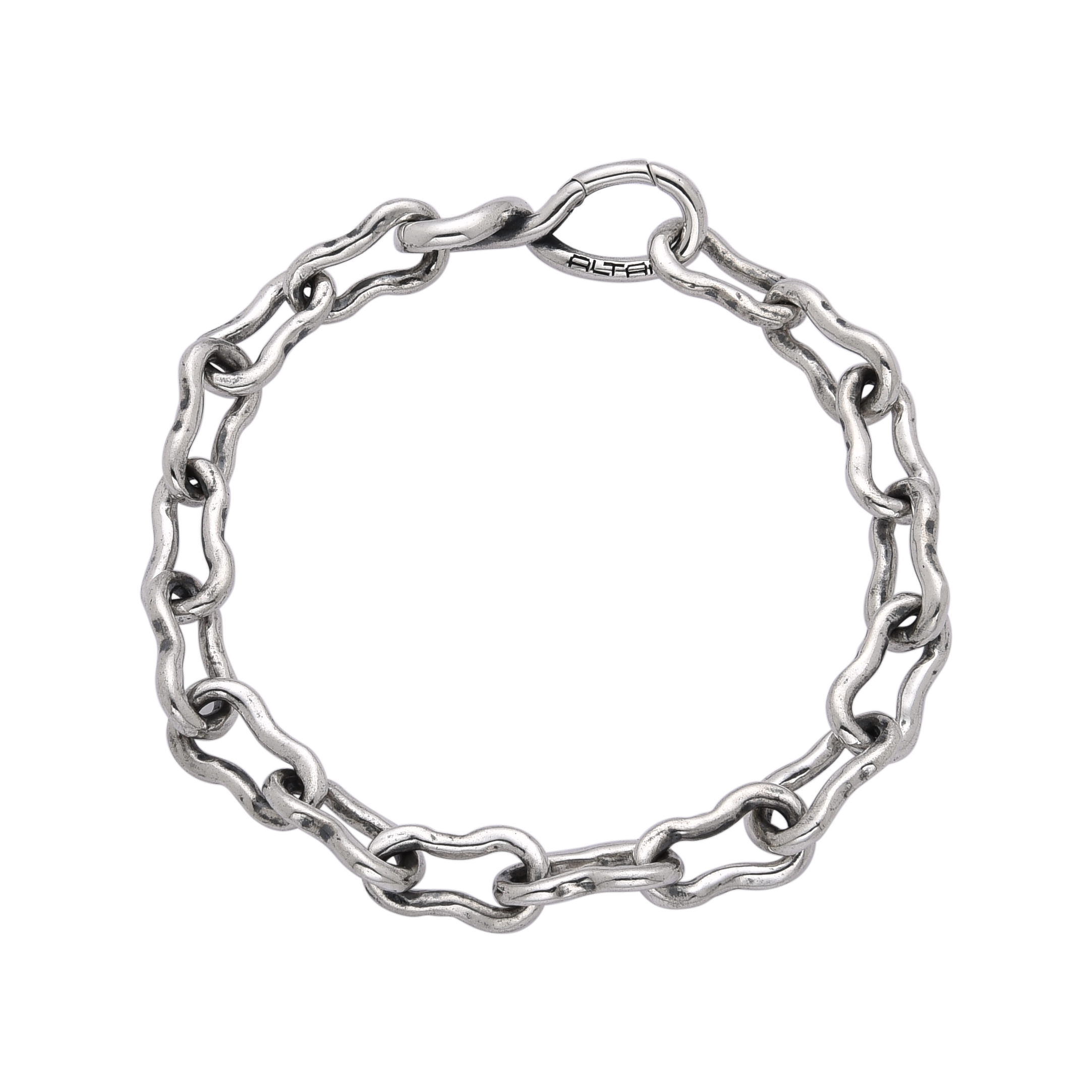 Organic sterling silver with molten-like links and a handmade finish. Rugged and minimal, like a recovered artefact.