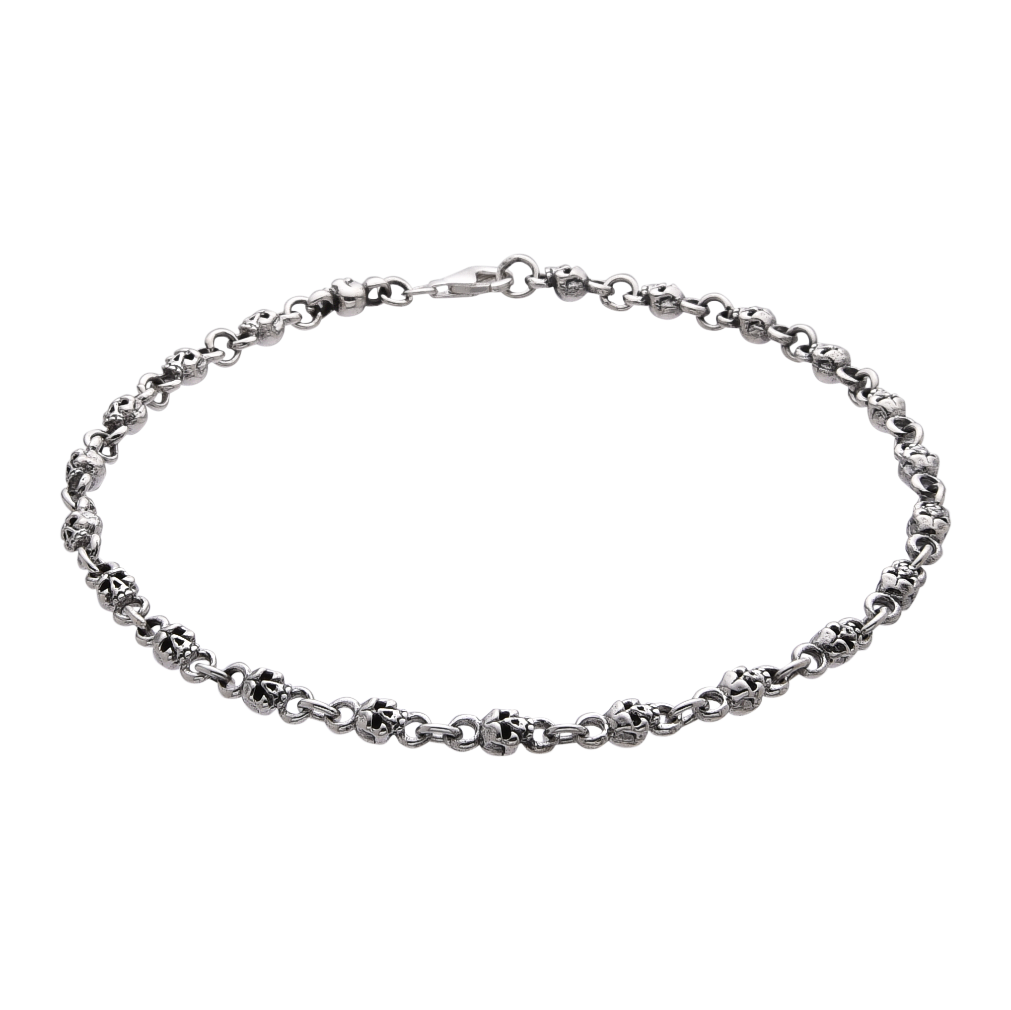 Sterling silver links detailed with miniature skulls. Oxidised and polished for contrast, creating a rugged, gothic look.