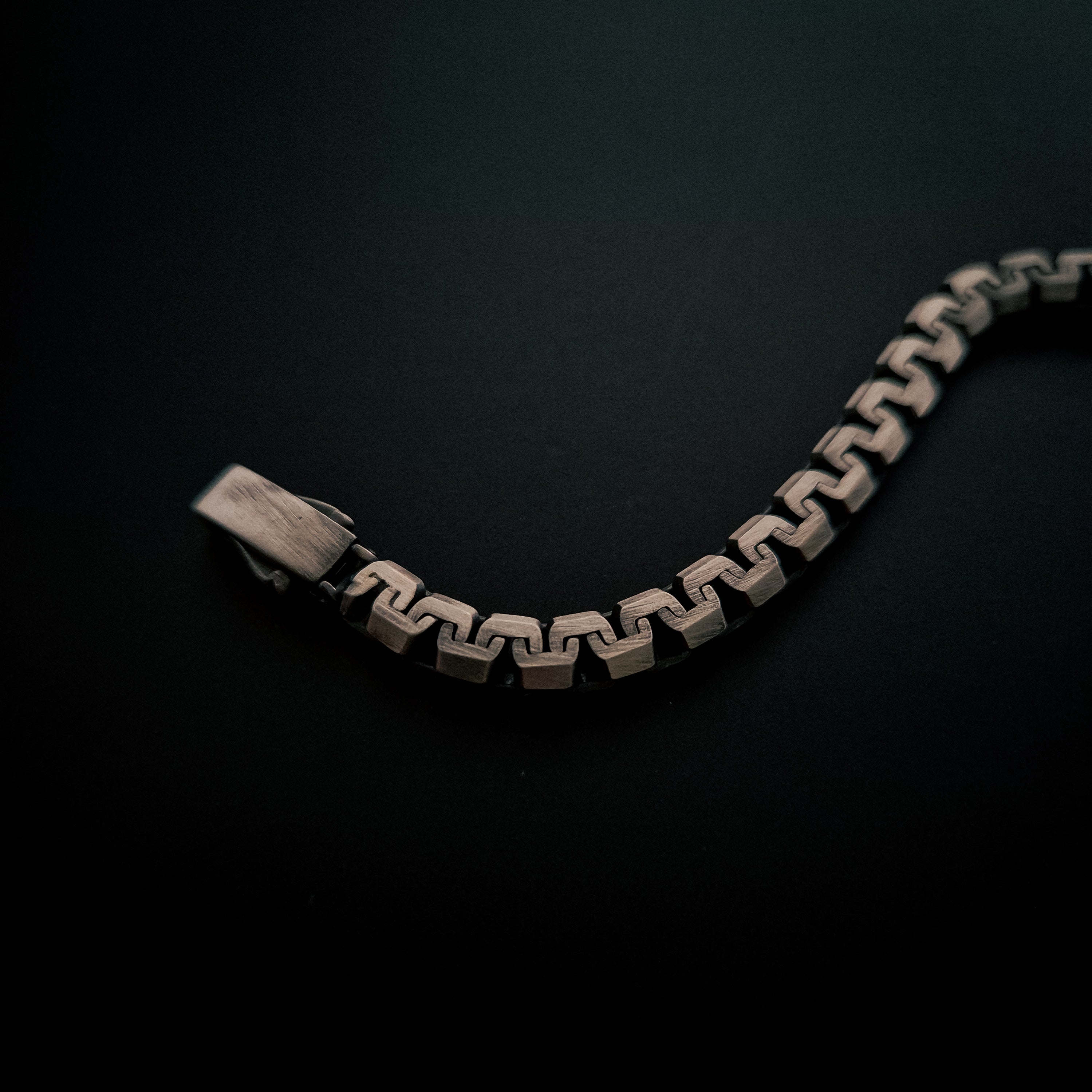 Industrial-style sterling silver links with ruthenium plating and a brushed gun-metal finish, secured with a micro-fused clasp.