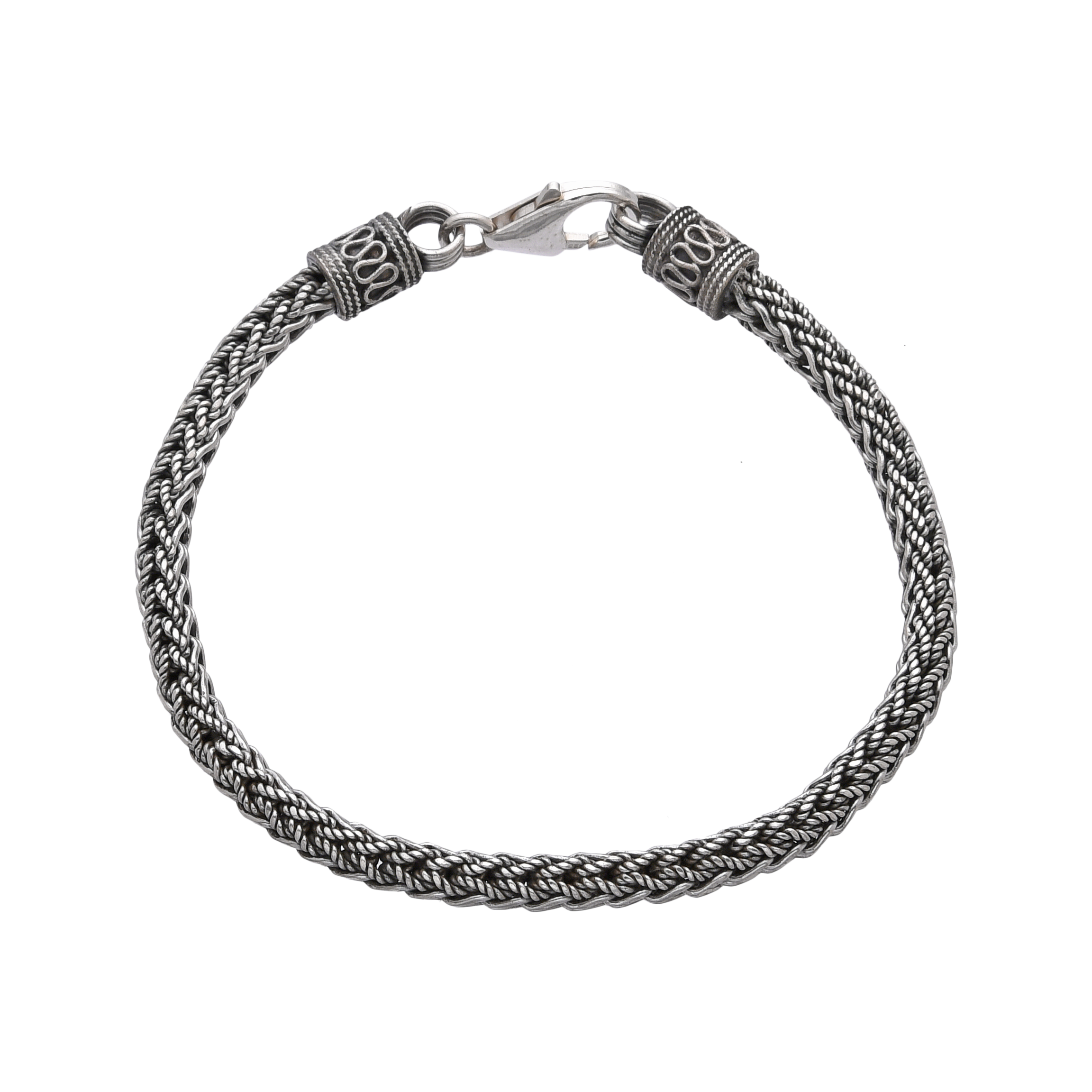 Braided sterling silver chain with oxidised details and decorative end caps. A textured design with a secure clasp for a classic look.