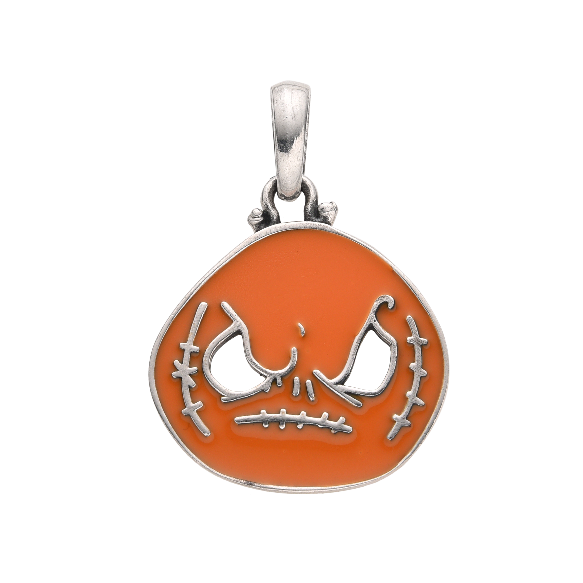 Sterling silver pendant shaped as a pumpkin face with vibrant orange resin and stitched detailing.
