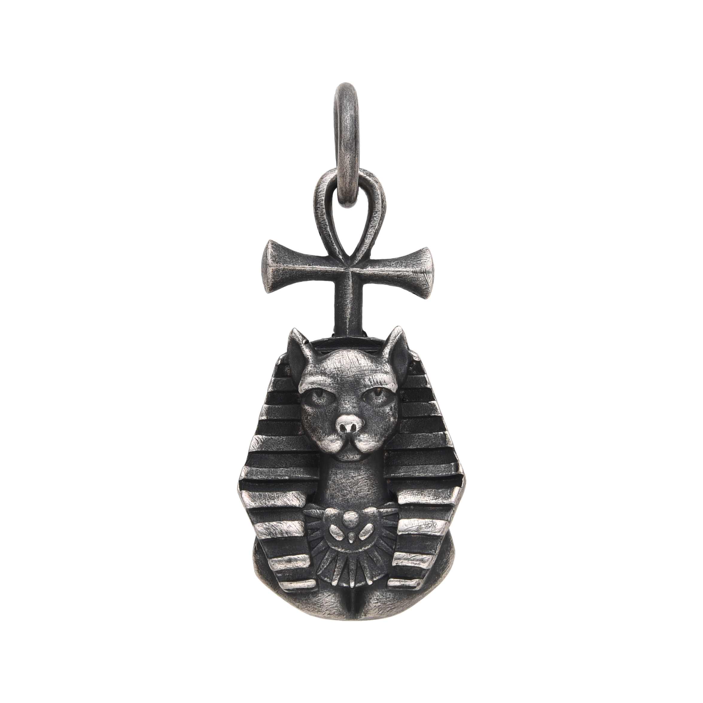 Antique-finished sterling silver pendant shaped as a regal cat head crowned with an Ankh symbol.