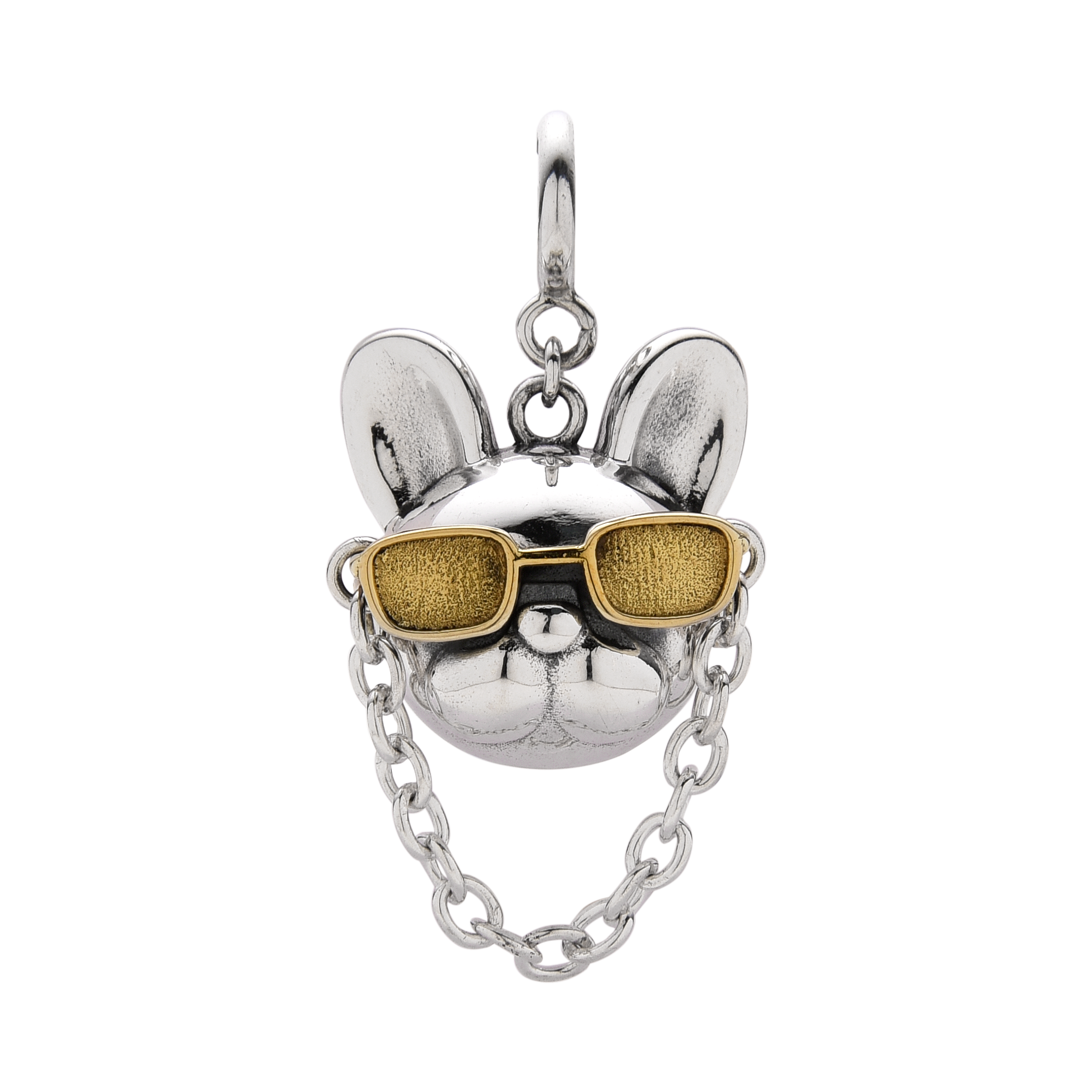 Sterling silver pendant with a stylised bulldog head, gold-plated sunglasses, and a chain collar.
