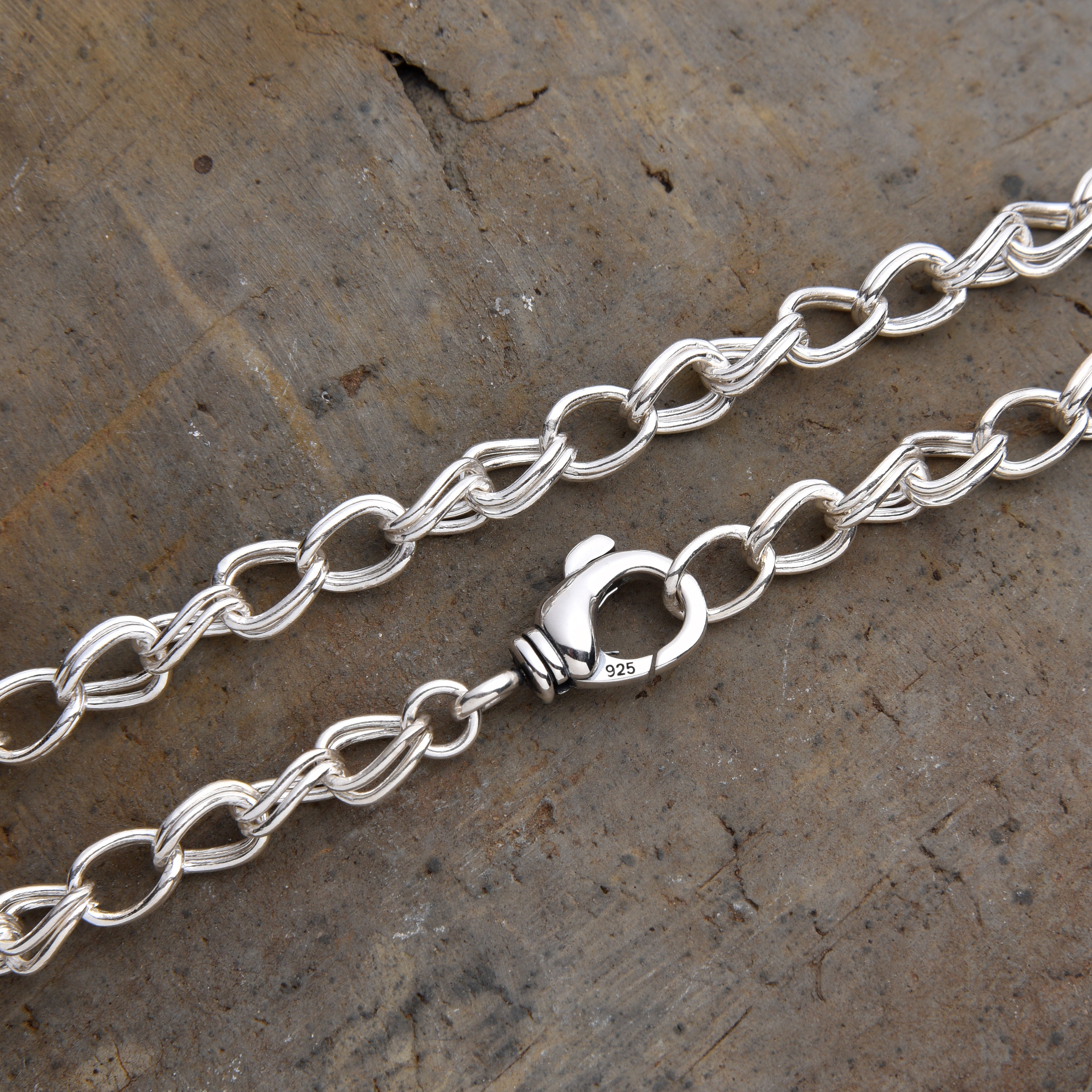 Sterling silver chain with unique double interlocking links that blend boldness and elegance. A fluid, modern design with a nod to classic style.