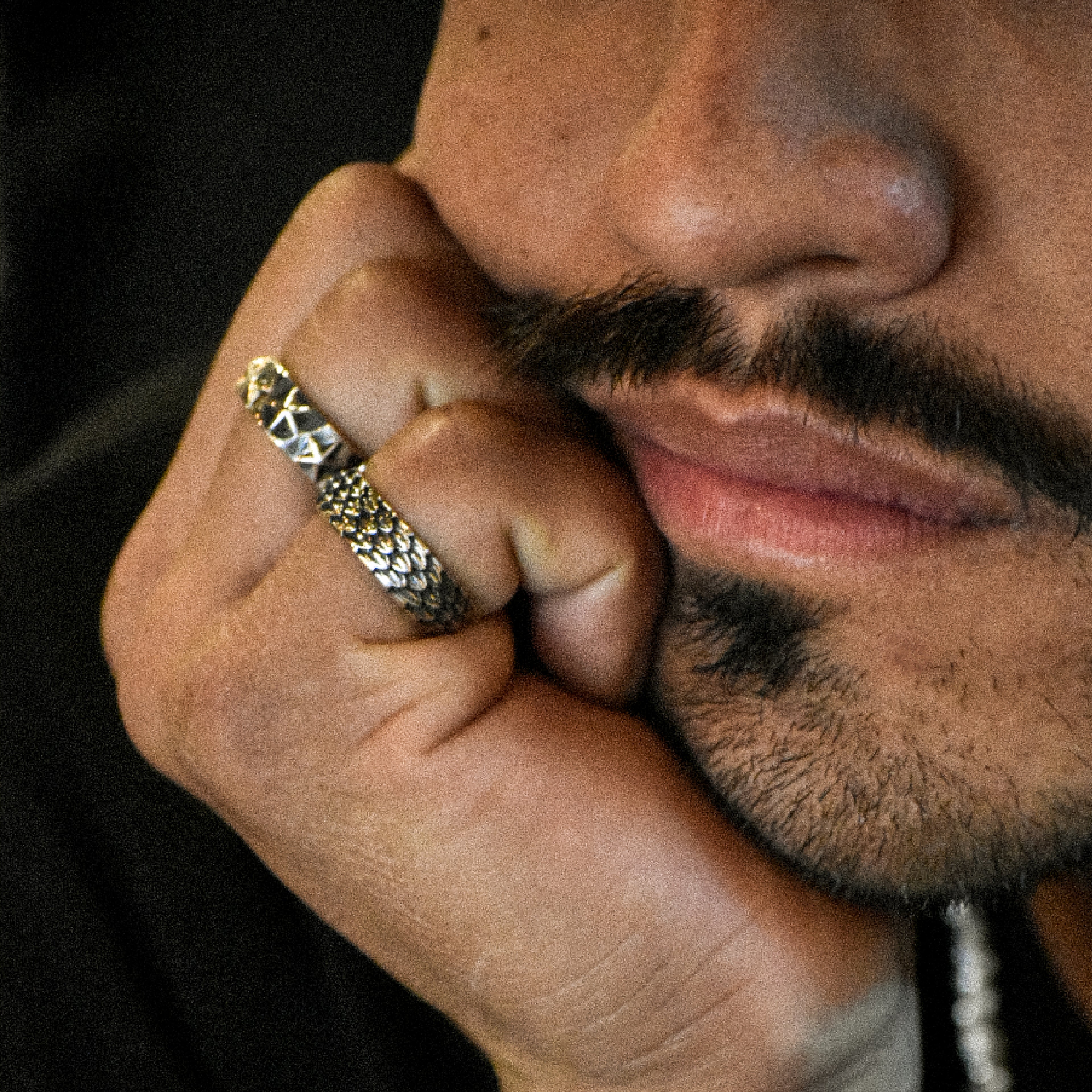 Carefully hand-finished sterling silver piece, featuring a detailed scale pattern with a polished and oxidised finish.