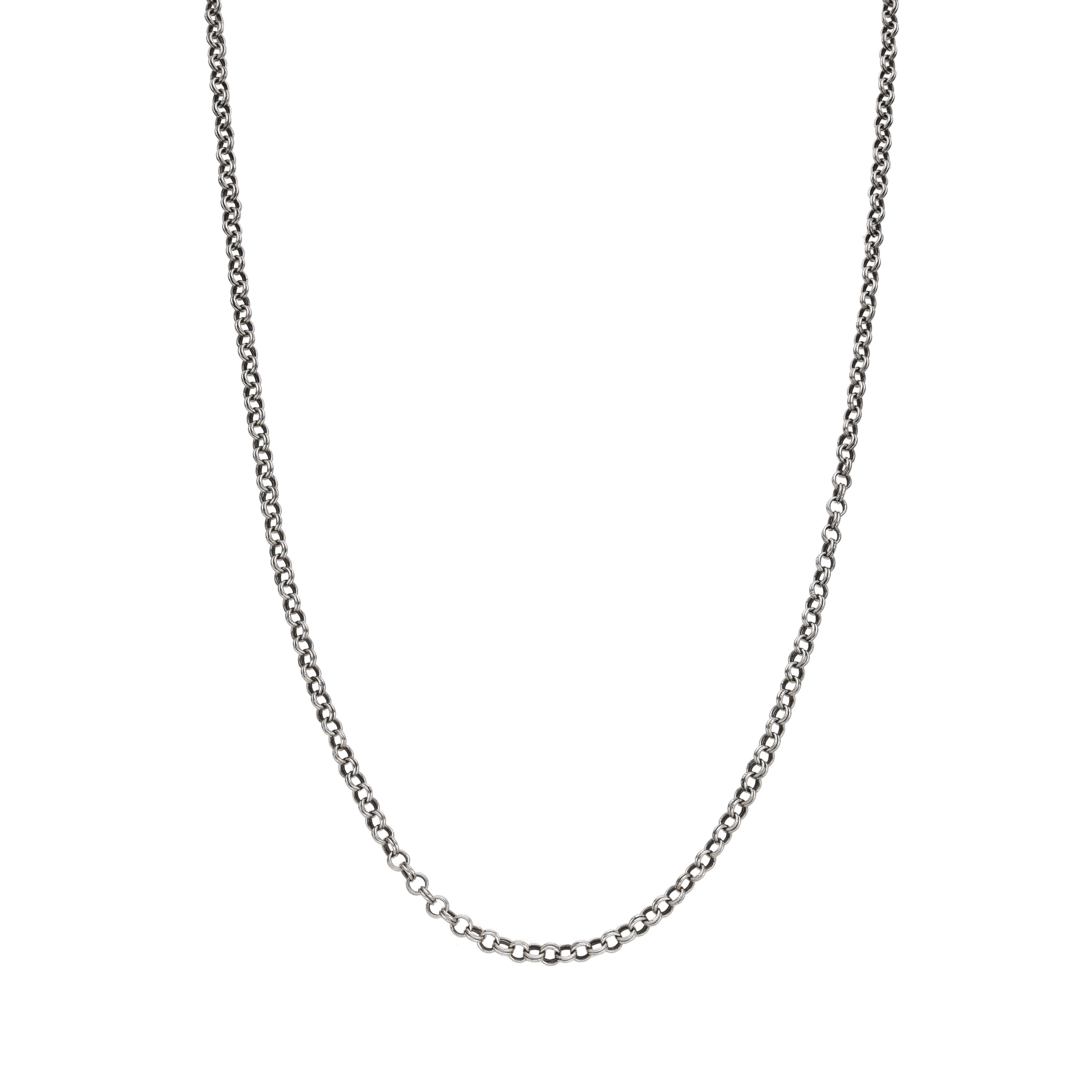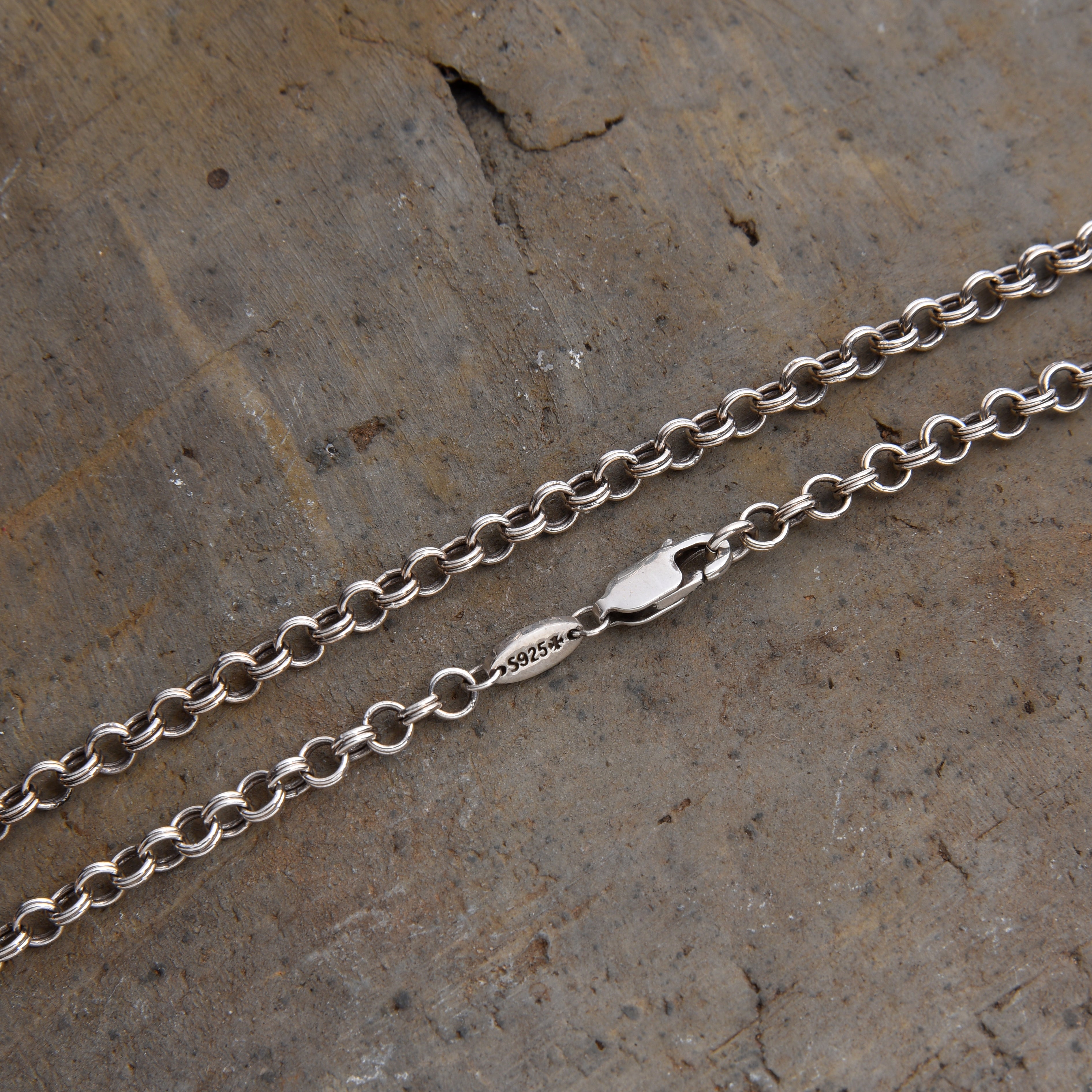 Sterling silver chain with double interlocking links. Its flowing design wraps comfortably around the neck. Versatile enough to wear alone or pair with your favorite pendants.